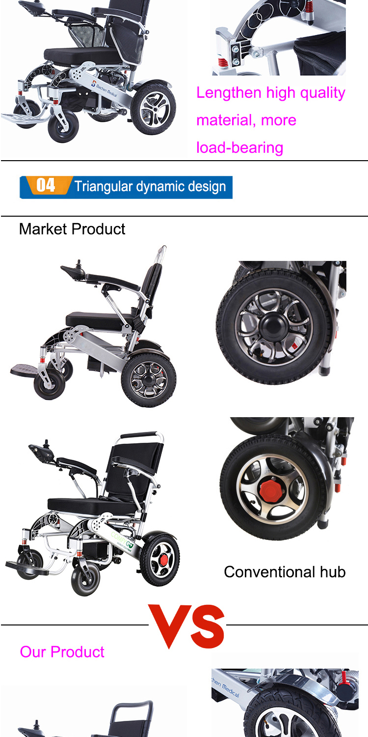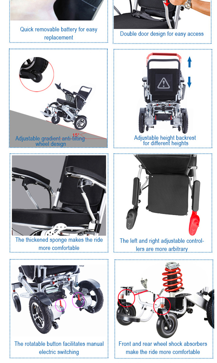 Our sleek and stylish wheelchair has been designed with a reinforced frame to provide a sturdy and strong base; this paired with its suspension system and intelligent joystick control gives a confident user experience. Easy folding in three steps to make travelling and storage more convenient. The armrests have been specially designed to be flipped up to enter/exit the wheelchair with ease, and most conveniently the arms are adjustable which allows the seat to become bigger and more tailored to you. The seat itself is wider with a higher backrest than other competitors to allow for more room. The seat cushion has been designed to be comfortable and able to be removed to be washed and cleaned.