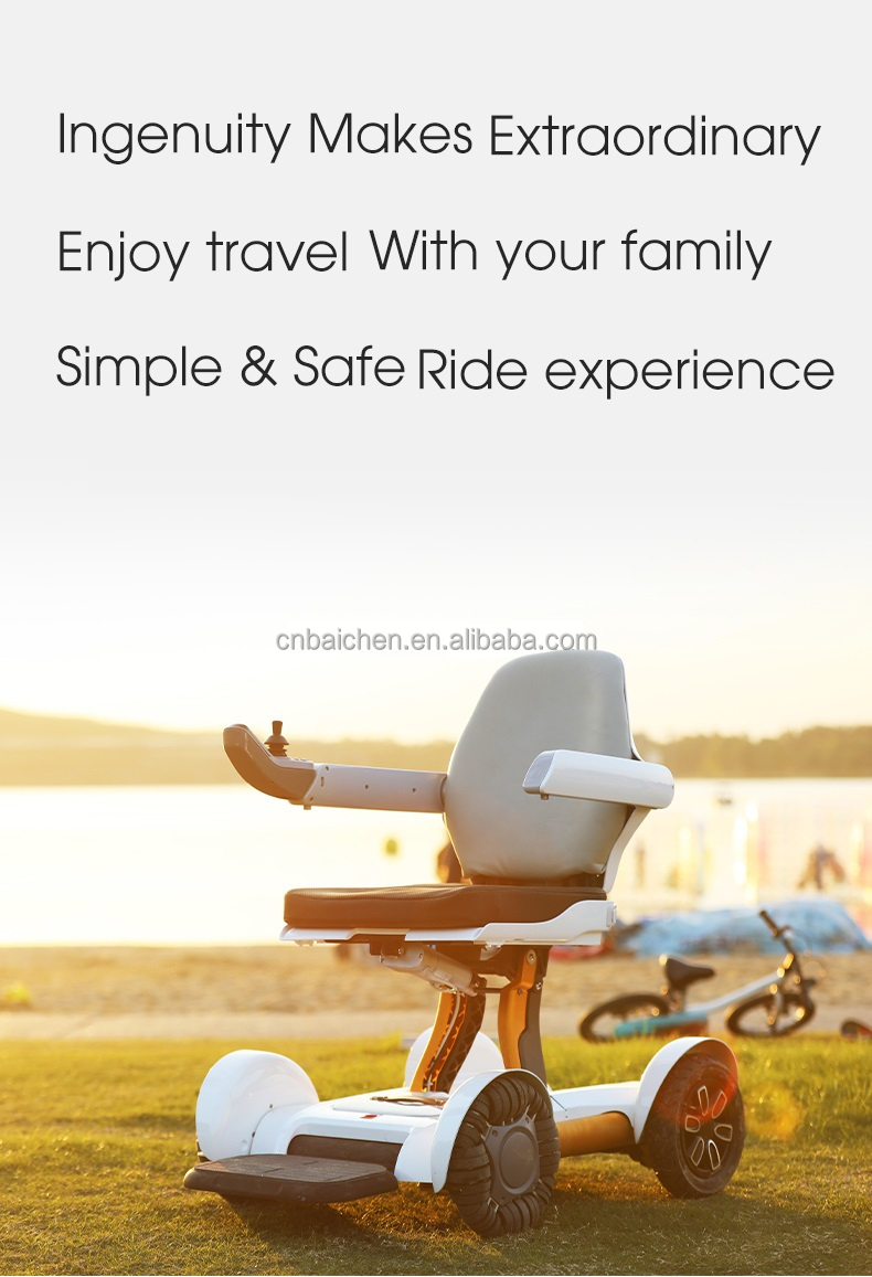 This electric wheelchair can be used at low speeds, in good road conditions, and can handle moderate slopes.